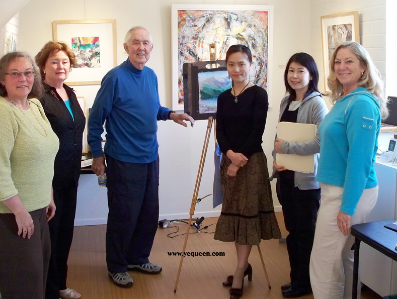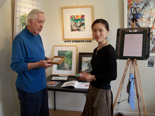 上图左(二)凯思林来自纽约,后墙上的抽象画就是她的作品,应该说水平还是相当不错的,剩下4位都不是这次画展的成员,但是都是美协的会员,来参观学习的。 左图我与Rodger探讨油画棒的技术。 |