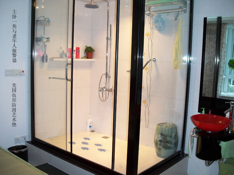 老人防止滑倒的美国鱼纹垫子,累了可以休息的中国古代石凳,把手,牙膏牙刷在浴室和洗浴盆都要备用,方便。 床头最好用触摸灯,免得夜里瞎猫乱摸。 |