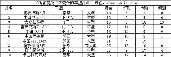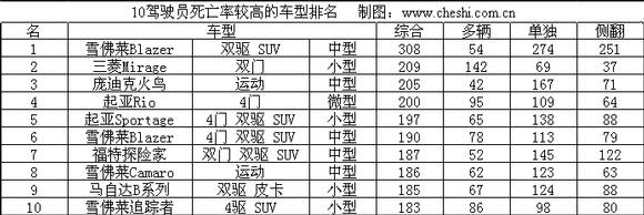 美公布10大死亡率最高车型及10大最安全车(附图表)