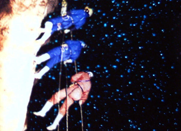 生命似乎赋予热爱运动的人,攀岩是一项具有挑战的运动项目之一,左图是攀岩前的准备活动,由于这次攀岩是向下攀登,并且要经过暗流,飞瀑,星星岩,所以在行动之前,每个人换上了潜水衣,并在腰间扣上结实的安全索.