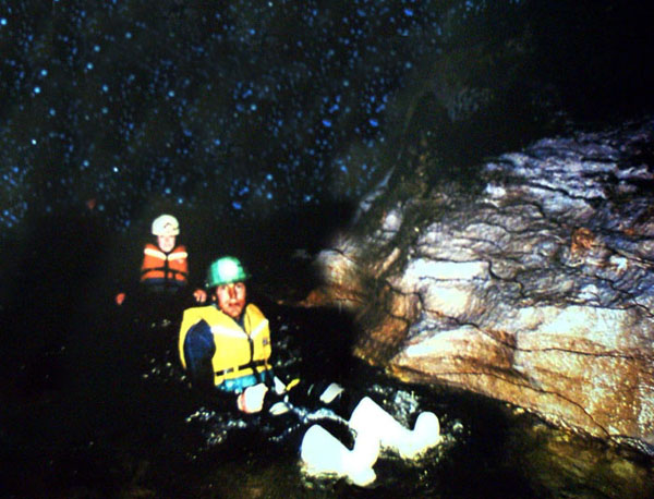 我感悟为何大自然给予这些微生物如此的空间,竟然在这无人的洞底制造出如宇宙的奇妙美景. 我特别观察这些闪烁的"星星"原来是一种特别的微生物,它们憩息在岩石的顶端,形成现在的情景. blue fly larva | |