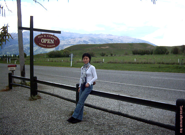 南岛片地见牛羊,我身后远处依稀可见的灰褐色都是sheep,可爱之处是在于我可以沐浴在青天,碧草,雪山之中,在一个荒芜人烟的郊外,随地而息的靠着赋予古铜绿的栅榄边,寂静离我如此接近,偶有的风,轻轻吹拂左侧零星的树叶. 最好不过在此饮用下午茶. 这里是Tarras town. |