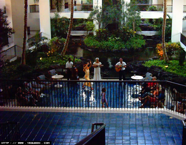 运气总是很好,下晚的时候正好有歌舞,刚才在楼梯的中部,现在走下来,可以看到底层原来是一个水池花园,客人可以在这里边看歌舞边吃下午茶.