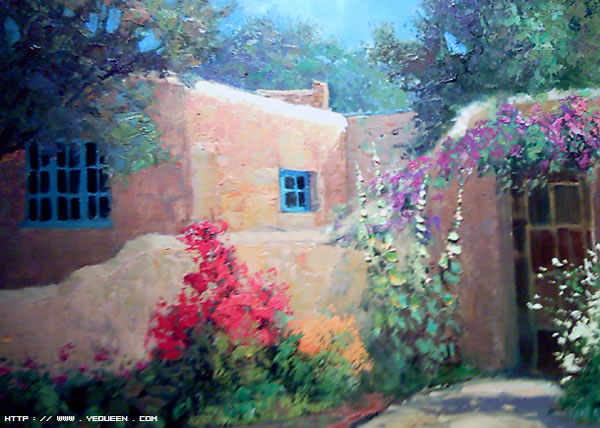 这张就是典型的印地安西南部州的建筑油画图.
