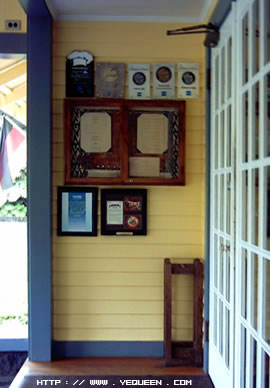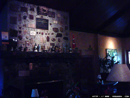 餐厅火炉的墙壁上挂满了该处获奖的奖杯和奖状.