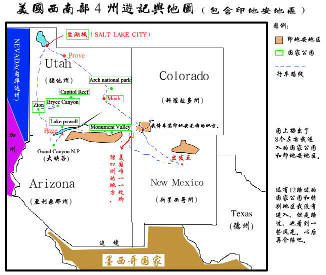 此行所进入的国家公园和国家属于土地保护区有: Arch National Park Bryce Canyon National Park Zion National Park Grand Canyon National Park Lake Powell Glen Canyon Monument Valley Navajo Indian Reservation Grand Staircase-Escalante National Monument. 路过却没有进去的(时间问题) Capitol Reef National Park Canyonlands National Park 还有一些州际公园,我名字给忘记了(不能怪我,车速有时候太快,来不及看地区的名字.) 经过的主要城市 Moab Prove Salt lake city Page Window Rock 还有很多小镇,不记得拉.(应该大大小小加起来有12个)