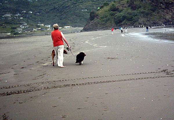 来海滩遛狗的人也不少,这两只狗太漂亮了,快来一个抢拍.